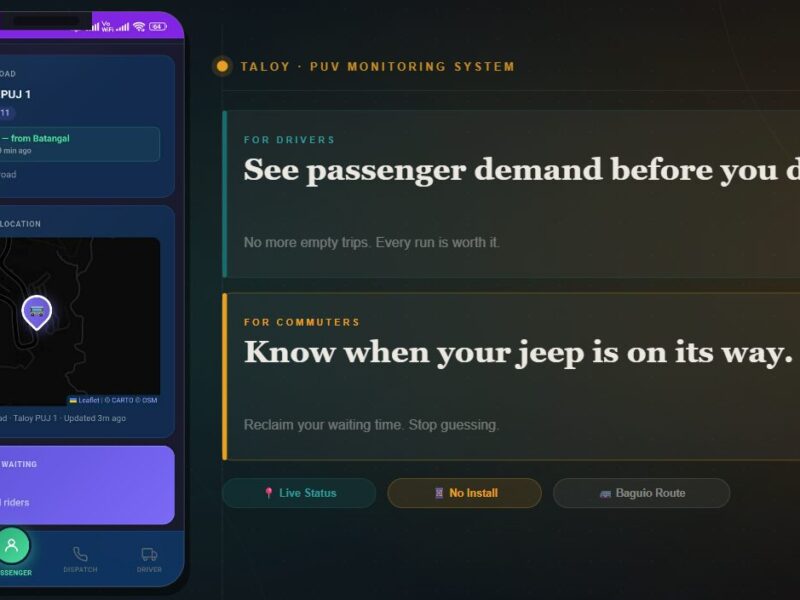 Taloy PUV is a real-time commuter and jeepney tracking system that lets passengers signal their presence and helps drivers depart at the right time—making public transport more efficient, predictable, and responsive.